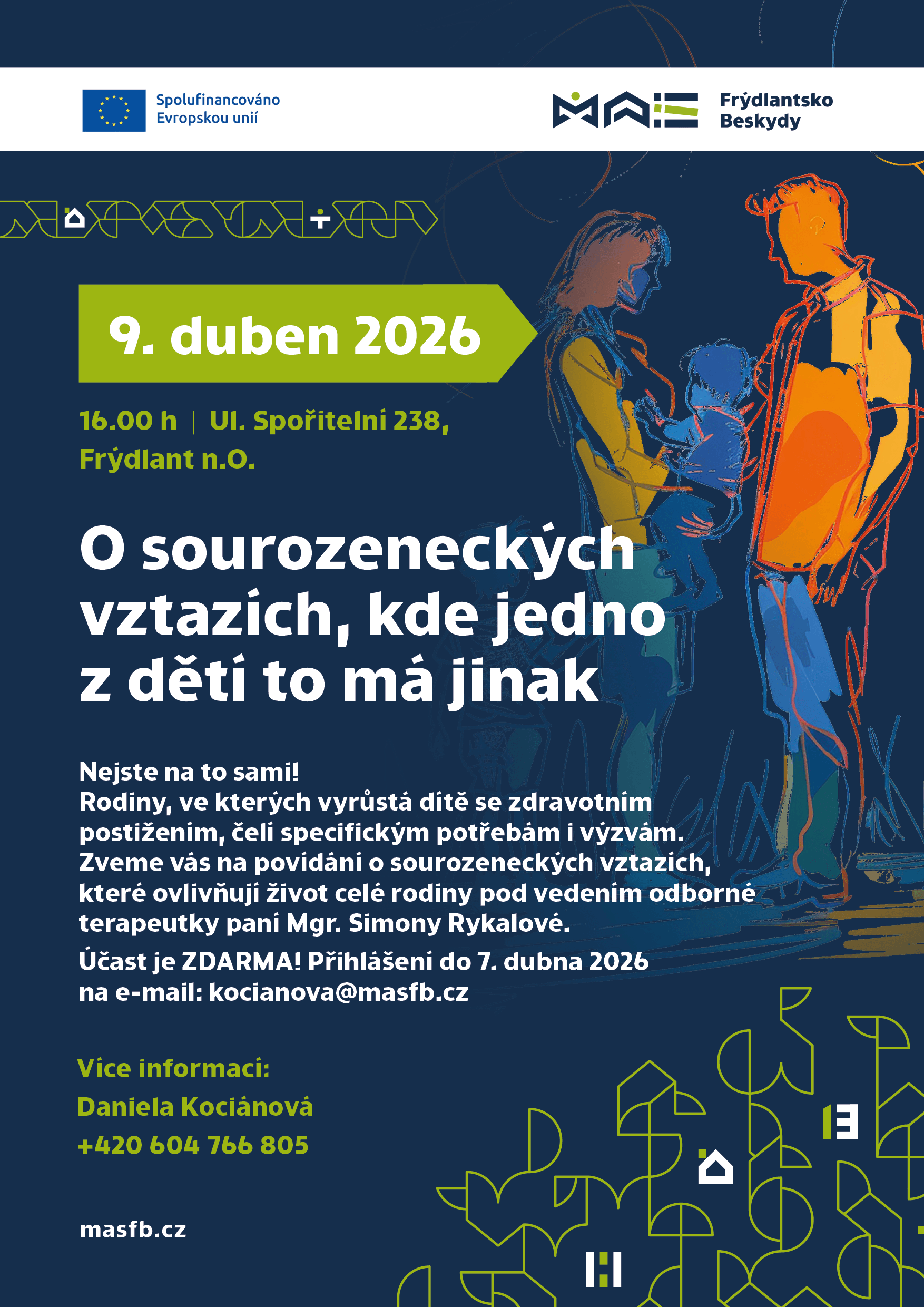 9. dubna 2026 od 16.00 hodin se uskuteční přednáška „O sourozeneckých vztazích, kde jedno z dětí to má jinak“, kterou povede zkušená terapeutka Mgr. Simona Rykalová. Seminář se zaměří na to, jak podpořit zdravé vztahy mezi sourozenci v rodinách, kde jedno z dětí potřebuje více pozornosti a podpory.