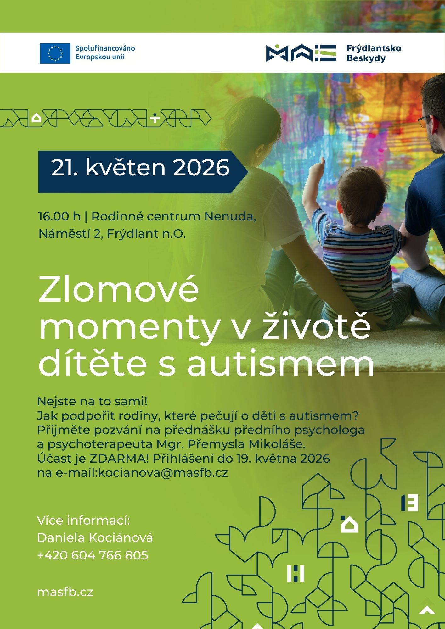 21. května 2026 od 16.00 hodin proběhne přednáška „Zlomové momenty v životě dítěte s autismem“, kterou povede psycholog a psychoterapeut Mgr. Přemysl Mikoláš. Seminář se zaměří na důležité situace v životě dětí s poruchou autistického spektra a jejich rodin.