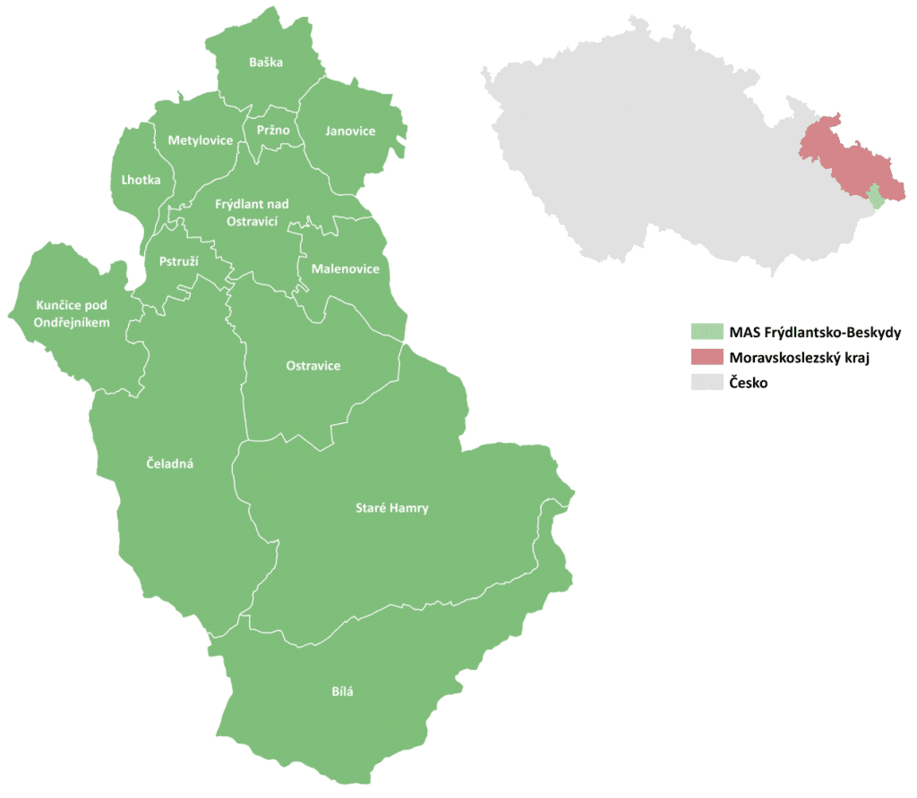 MAS Frýdlantsko – Beskydy z.s. se nachází v Moravskoslezském kraji, v okrese Frýdek-Místek a rozkládá se na území obcí Město Frýdlant nad Ostravicí | obec Baška | obec Bílá | obec Čeladná | obec Janovice | obec Kunčice pod Ondřejníkem | obec Lhotka pod Ondřejníkem | obec Malenovice | obec Metylovice | obec Ostravice | obec Pržno | obec Pstruží | obec Staré Hamry. Celková rozloha území k 31.12.2019 činila 33 748 ha. Počet obyvatel MAS Frýdlantsko – Beskydy k 1.1.2024 činil 30 042 osob s průměrným věkem 42,7 let.